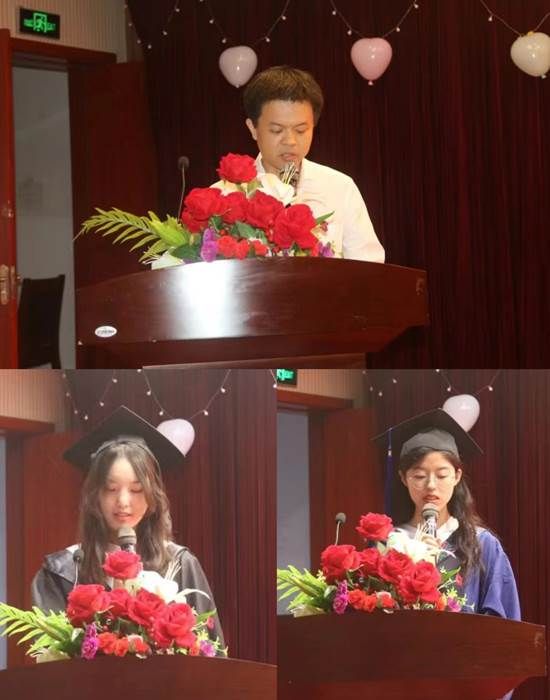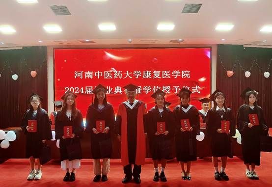 学院副院长刘斌通报2024届毕业生授予学位情况和2024届毕业生取得的优秀成绩;教师代表陈岩表达了对毕业生的深深祝福和殷切期望,希望同学们努力拼搏,再创佳绩;河南省优秀毕业生、2019级中医康复学本科班王宁怡,以及河南省三好学生、2021级医学技术研究生丁志敏分别发表感言,分享了自己在校期间的学习经历和成长感悟,激励同学们要勇敢追求梦想,坚持不懈奋斗;学院党委副书记李伟峰、孟长海分别为省级优秀毕业生和校级优秀毕业生颁发荣誉证书并赠送毕业纪念品。与会领导为2024届硕士、本科毕业生扶正流苏并合影留念。