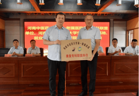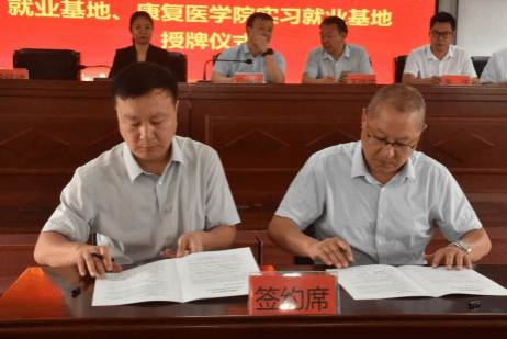 在仪式上,冯晓东院长为潢川县人民医院授牌,同时授牌“肉漫画 第一附属医院康复专科联盟单位”,党委副书记李伟峰与潢川县人民医院院长王劲签署就业基地建设协议书。