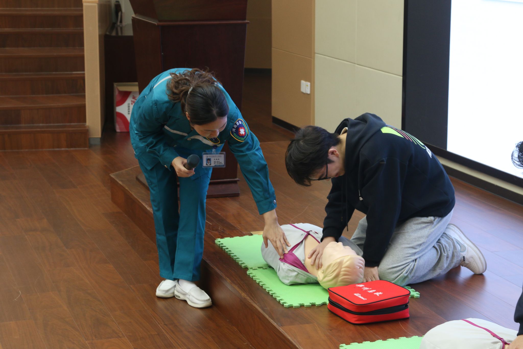 活动过程中,急诊科主任王双双首先为大家讲解了心肺复苏急救技术的操作流程,特别强调“黄金4分钟”是心脏骤停患者的“急救时间窗”,并科普了自动体外除颤器AED的使用方法。护士长张龙用通俗易懂的视频,生动细致的语言向大家讲解了海姆立克急救法的操作方法,尤其强调了婴幼儿卧位法的动作要领。活动最后,在培训人员的指导下,学生们纷纷参与到急救技能的模拟演练中,现场气氛热烈而有序。