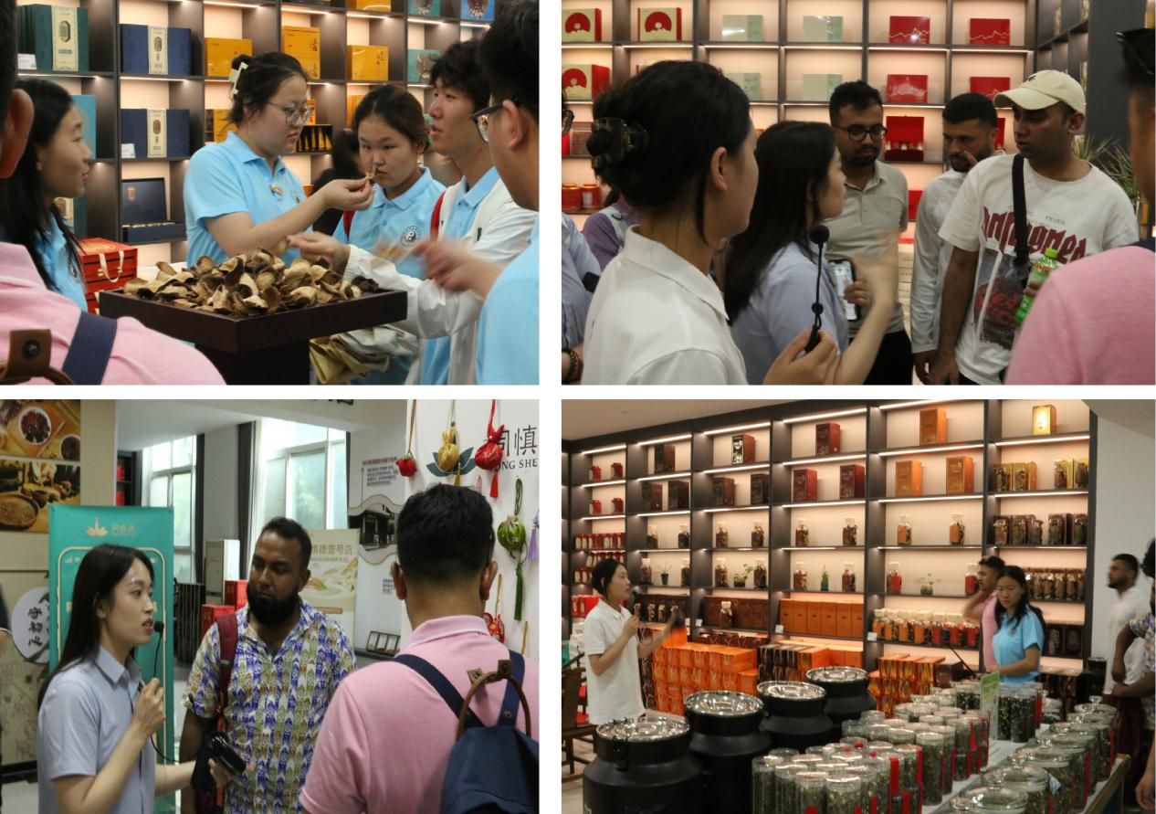 7月7日下午17时许,研学第二站走进青山药业,师生们首先被一层的五大主题展厅所吸引——“药之王”“药之都”“药之行”“药之坊”“药之品”。丰富详实的图文资料、珍贵的历史实物与前沿的三维影像技术相结合,生动展现出禹州作为药都的辉煌过往、中医药文化的源远流长,以及遵古炮制技艺的独特神韵,令师生们沉浸其中,深切感受中医药文化的博大精深。在二层的朱改莲全国老药工传承工作室,师生们有幸目睹了传统药材的精心制作流程,还品尝到了经九蒸九晒而成的黑豆、黑芝麻等传统药食,独特的口感与养生功效让大家赞不绝口。现场,留学生们对古老技艺展现出浓厚兴趣,在专业人员的悉心指导下,亲自上手体验药材砍切,零距离感悟“修合虽无人见,存心自有天知”这一传承千年的制药古训。朱改莲总经理还为师生们详细讲解了禹州特色工具“象鼻满月刀”的构造、使用方法,以及传统饮片切制的要领。在她手把手的耐心传授下,师生们亲身体验丹参切制,深刻体会到传统饮片切制中人与刀完美配合、依据药材特性赋形的高深技艺。