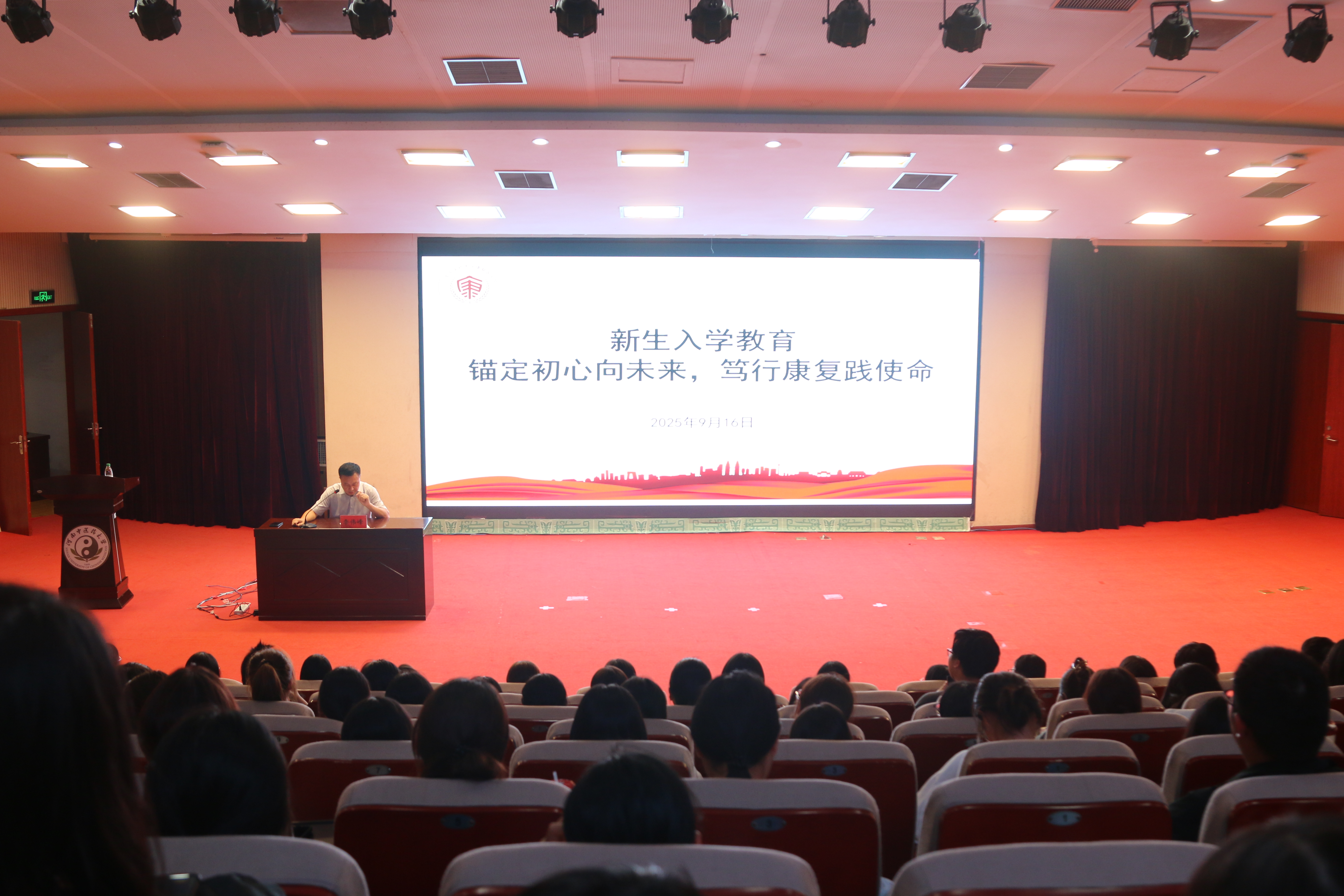 首先,李书记代表学院党委及全体师生员工,向全体新生表示最热烈的欢迎!同时,也向在军训中展现出顽强意志与良好风貌的同学们致以最诚挚的肯定。接着,围绕习近平新时代中国特色社会主义思想和党的二十大精神,结合学生日常学习生活从党建引领、专业认同、角色转变和职业坚守四个方面进行入学教育。他强调,要坚持把立德树人作为根本任务,全面贯彻党的教育方针,引导学生牢固树立中国特色社会主义道路自信、理论自信、制度自信、文化自信,自觉做共产主义远大理想和中国特色社会主义共同理想的坚定信仰者和忠实实践者。讲座中,李书记结合康复医学专业特点和学生成长实际,通过理论联系实际、历史与现实相结合的讲述方式,生动阐释了新时代青年肩负的责任与使命。他鼓励同学们坚定不移听党话、跟党走,把个人理想融入党和国家事业之中,努力成长为德智体美劳全面发展的社会主义建设者和接班人。