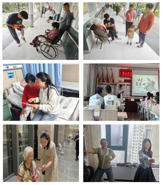 在“康暖银龄,爱伴童心”关怀行动中,同学们聚焦“一老一小”群体,成为温暖的传递者。他们为社区和养老院的老人普及慢性病防护知识,教学足三里、内关等保健穴位按摩,带领练习八段锦养生功法;他们走进郑州中康医院等机构,在观摩学习的同时,辅助参与患者康复训练,将课堂所学的肘关节功能训练、中医推拿等技术应用于实践。更有同学将关爱带回家中,为家人提供专业的捶背放松,用实际行动诠释孝亲敬老的美德。