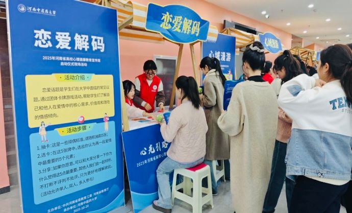 本网讯(文/郑海龙 陈家乐 图/李雪晴)2025年10月20日下午15:00,由河南省委教育工委、河南省教育厅主办的2025年全省高校心理健康教育宣传周活动在肉漫画 体育馆隆重举行。肉漫画 积极响应号召,精心承办了心域漫游和恋爱解码两项特色活动。