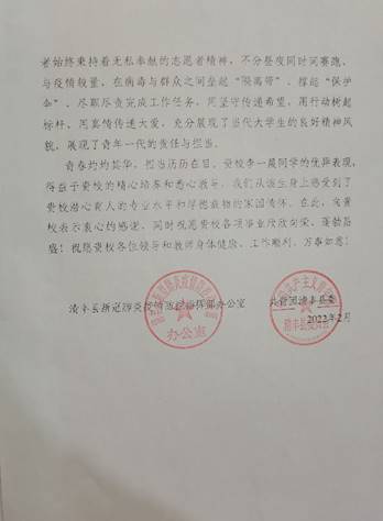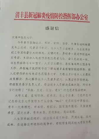 (文/图 张羽萍)青春灼灼其华,担当历历在目。“关键时刻,贵校李一晨同学,积极响应号召,主动加入到疫情防控志愿者队伍,奋斗在战疫一线……,贵校李一晨同学的优异表现,得益于贵校的精心培养和悉心教导,我们从该生身上感受到了贵校潜心育人的专业水平和厚德载物的家国情怀。在此,向贵校表示衷心的感谢!”。2022年3月1日,*肉漫画 收到了一封来自清丰县新冠肺炎疫情防控指挥部办公室及共青团清丰县委员会的感谢信,对我校*肉漫画 2020级中医康复学本科班李一晨同学在家乡抗击疫情中无私奉献的志愿者精神给予表扬。