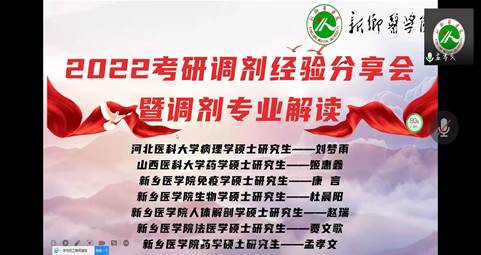 调剂成功的新乡医学院药学硕士研究生孟孝文同学积极准备了有关考研调剂问题的材料,并邀请河北医科大学病理学硕士研究生刘梦雨同学、山西医科大学药学硕士研究生姬惠鑫同学、新乡医学院免疫学硕士研究生康言同学、新乡医学院生物学硕士研究生杜晨阳同学、新乡医学院人体解剖学硕士研究生赵瑞新同学、新乡医学院法医学硕士研究生贾文歌同学向毕业生分别介绍了自己所在专业是如何调剂成功的,分享了自己的考研经验和心得,他们精彩生动、细致入微的讲解给毕业生点明了新思路、指明了新方向,也让康复考研的职业规划看到了新的可能性。
