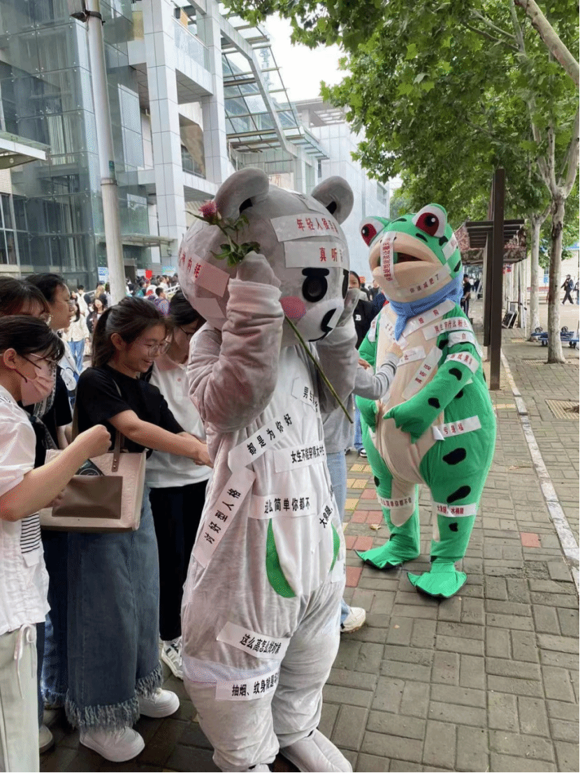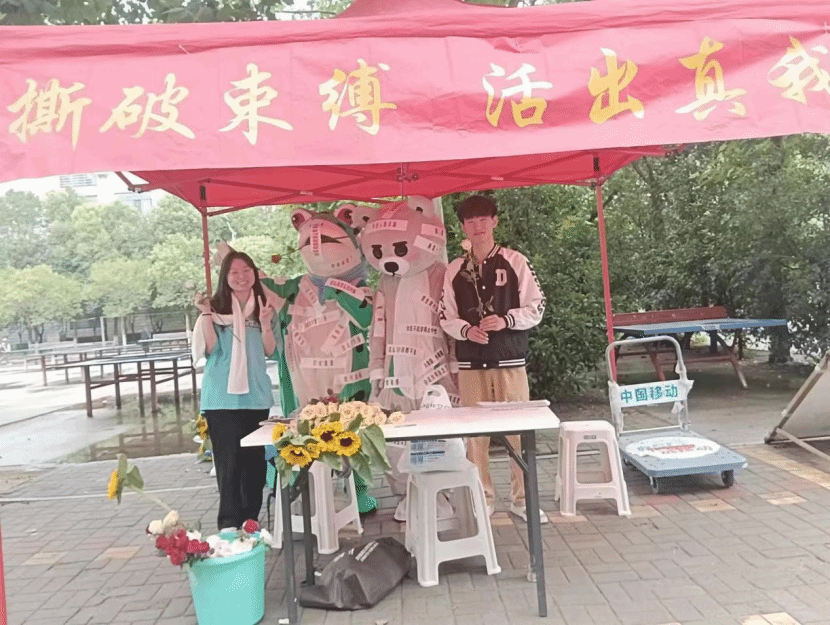 活动要求参与学生撕下玩偶身上的负能量标签,撕掉标签后工作人员会为参与学生发放一个钥匙扣或者书签,旨在鼓励同学们撕破标签束缚活出真我。中午13:00,活动正式开始,许多同学被玩偶吸引,在了解活动规则后同学们欣然参与活动,一张张标签被撕下,一朵朵鲜花被赠予,都是在打破社会的刻板印象。来往的同学络绎不绝,工作人员组织现场有序进行,校园的一条街道上充斥着鲜花的芬芳,并随着人群流动逐渐盈满校园,校园中不断增添着生动的色彩,活动前期准备的钥匙扣和书签很快发放完毕。中午14:00,活动落下帷幕,现场只余玩偶身上“撕破束缚”的痕迹,这是同学们对束缚自己创新与活力的锁链的勇敢一击、是对未来的殷切期望、是青春的活力在涌动!