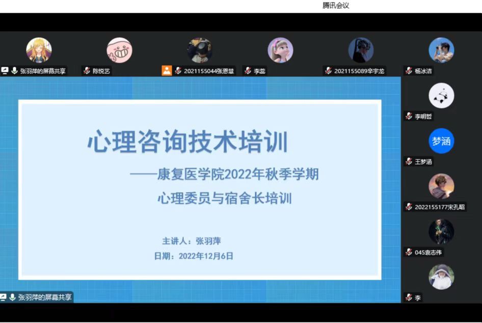 (图/文 张羽萍)为了满足学生可持续发展的需要,提高学生综合素质,给学生创造出自由的心灵空间,帮助学生学会人际沟通相关技巧,从而从容应对各种挑战与挫折,*肉漫画 于2022年12月6日下午19:00在腾讯会议(线上)召开心理培训,*肉漫画 全体心理委员、宿舍长及学生会心理生活部成员参加此次培训。会议由*肉漫画 心理生活部部长张恩慧主持。