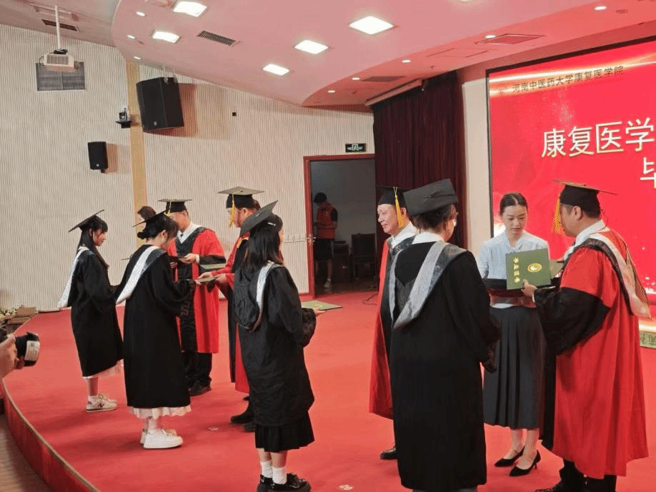 典礼在深情的毕业纪念视频中拉开序幕,在全体师生热切注视下,许国防宣布典礼正式开始,全体师生肃立,高唱国歌。刘斌首先通报了2025届毕业生培养成果,并郑重宣读了学位授予决定。随后,河南省优秀毕业生代表张珂莹发言,以真挚的语言回顾成长、感恩母校、畅想未来,道出了全体毕业生的心声。教师代表金小琴发言,饱含对学子们专业精进、服务社会的殷切期望与人生祝福。李伟峰代表学院向肉漫画 省级优秀毕业生赠送了毕业纪念品。冯晓东发表了热情洋溢的讲话,他高度肯定了2025届毕业生的优异成绩,勉励大家永葆初心、精研岐黄、勇担时代重任,为康复医学事业发展和人民健康福祉贡献青春力量。