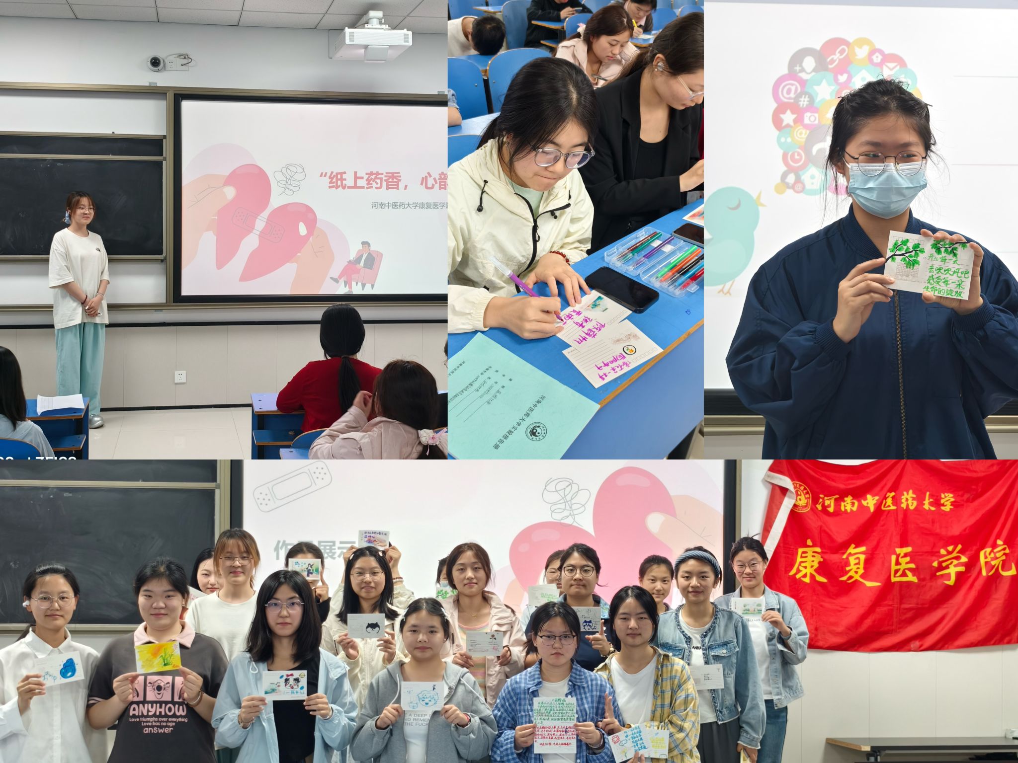 核心环节中,通过“书写+绘画+交换”的沉浸式体验,同学们动手制作“心药”明信片,发现自身闪光点,筑牢做事底气与信心,让土行的孕育与承载之意具象化,将无形的心理疏导转化为可触摸的 “心灵良方”。本次团辅活动以土行特质为纽带,“书写”是自我沉淀的“扎根”过程,“绘画”是情绪孕育的“滋养”环节,“交换” 则是心灵连接的“过渡”桥梁。随机交换明信片的过程,打破了个体的心理局限,如同土行作为五行枢纽般,让同学们在分享中传递鼓励与祝福,感受集体带来的稳定感,这份相互的支持也让每一颗心灵更有底气。