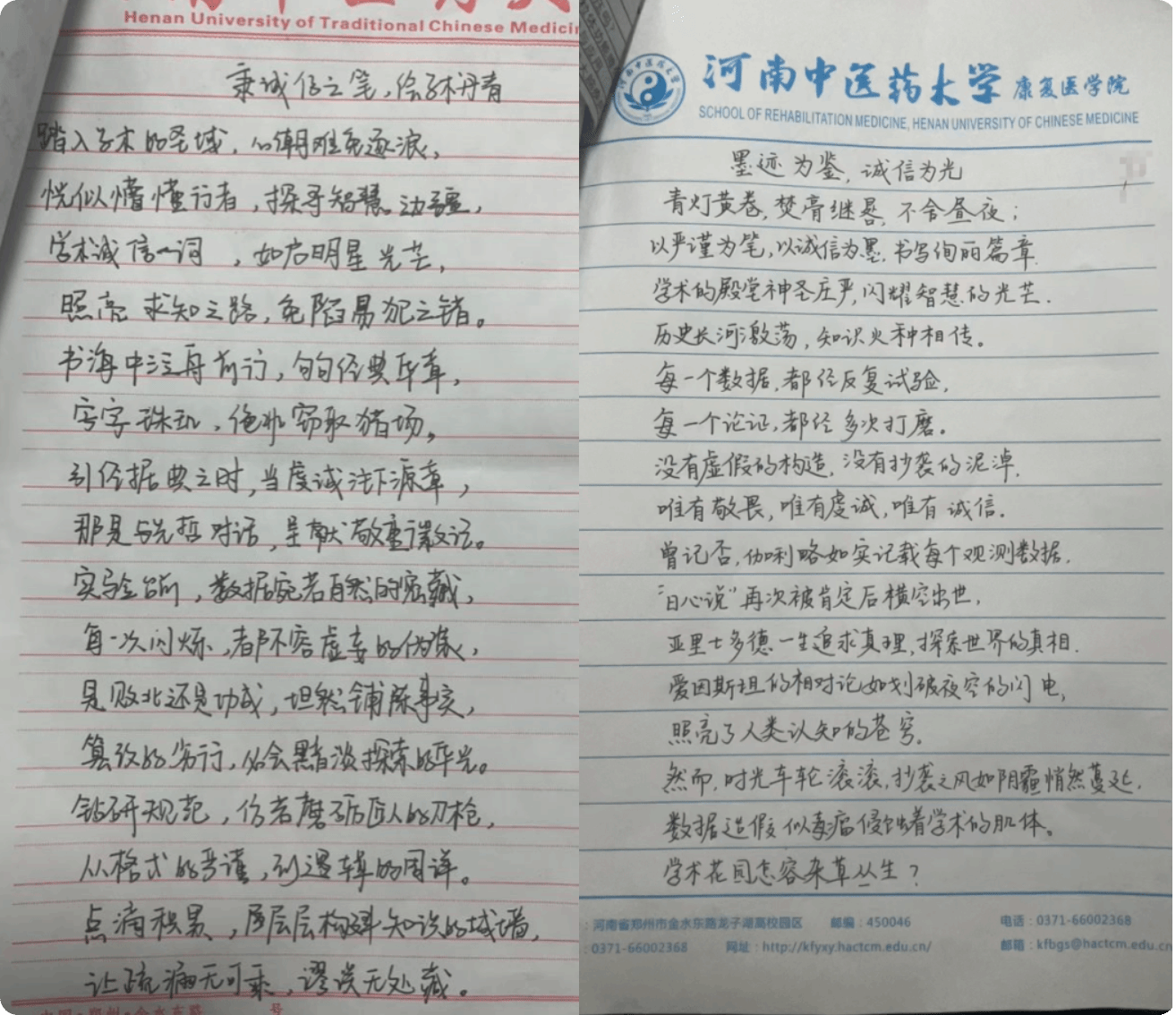本次活动共收到征文作品25部,在征文中,参赛者们从不同角度阐述了诚信在个人成长、学术科研以及校园学风建设中的重要意义。从对学术造假的犀利批判,到对日常学习中点滴诚信之举的深情颂扬;从理论层面探讨诚信对知识传承的基石作用,到讲述身边故事彰显诚信人物的榜样力量,参赛作品视角多元,内容丰富。充分展现了康复医学院学子对诚信与学风建设的深刻理解和积极探索,反映出学院对诚信学风建设的高度重视。